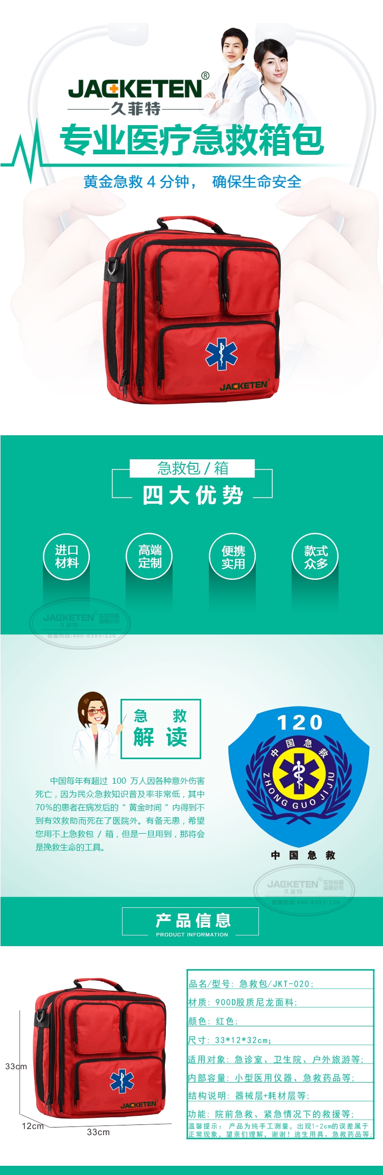 品名/貨號(hào):急救包/JKT-020;材質(zhì):900D股質(zhì)尼龍面料;顏色:紅色;尺寸:33*12*32cm;適用對(duì)象:急診室、衛(wèi)生院、戶外旅游等;內(nèi)部容量:小型醫(yī)用儀器、急救藥品等;結(jié)構(gòu)說明:器械層+耗材層;功能:院前急救、緊急情況下的救援等