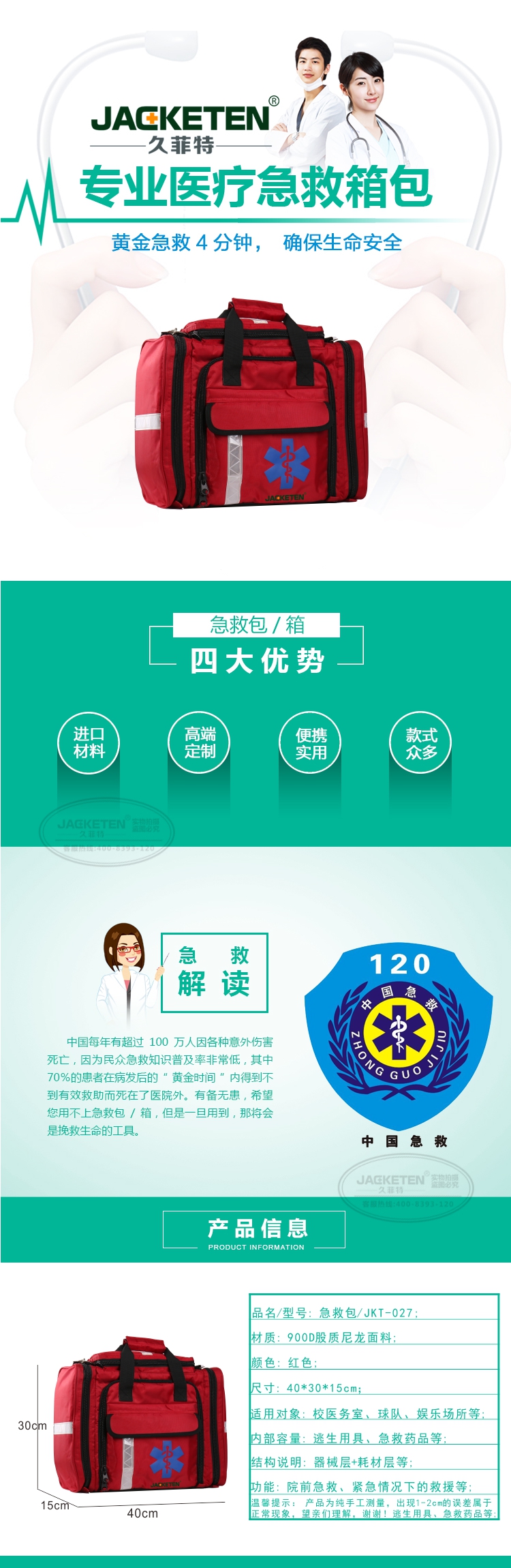 品名/貨號:急救包/JKT-027;材質:900D股質尼龍面料;顏色:紅色;尺寸:40*30*15cm;適用對象:校醫(yī)務室、球隊、娛樂場所等;內部容量:逃生用具、急救藥品等;結構說明:器械層+耗材層;功能:院前急救、緊急情況下的救援等