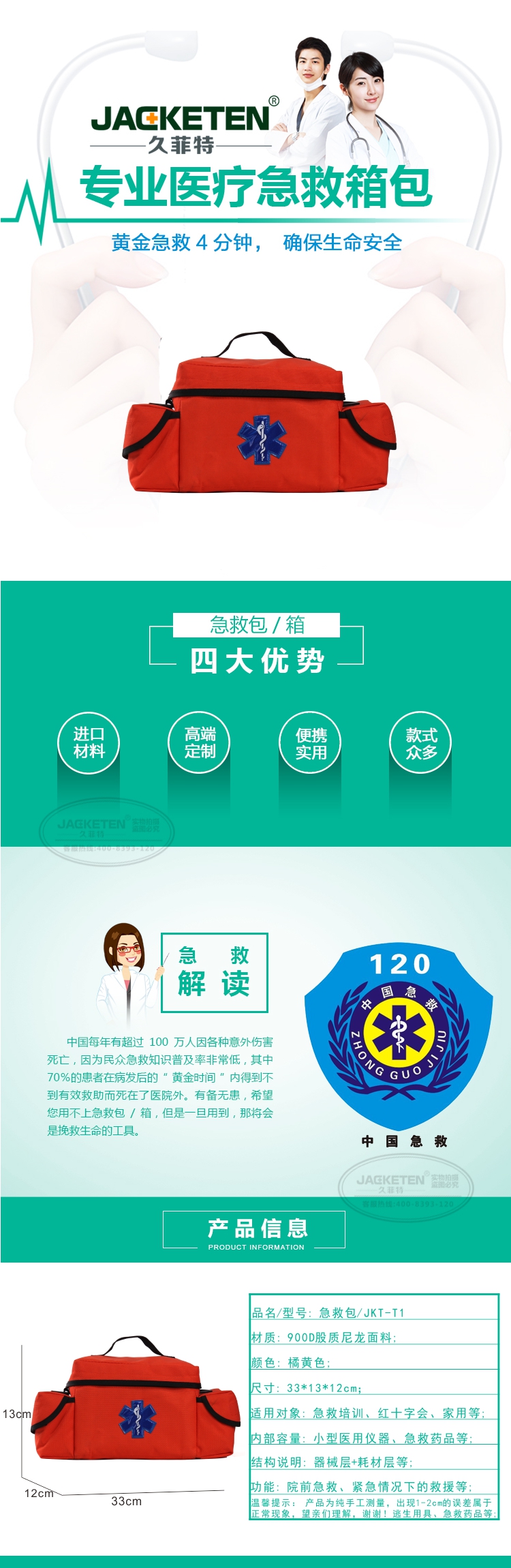 品名/貨號:急救包/JKT-T1;材質(zhì):900D股質(zhì)尼龍面料;顏色:橘黃色;尺寸:33*13*12cm;適用對象:急救培訓、紅十字會、家用等;內(nèi)部容量:小型醫(yī)用儀器、急救藥品等;結(jié)構(gòu)說明:器械層+耗材層;功能:院前急救、緊急情況下的救援等